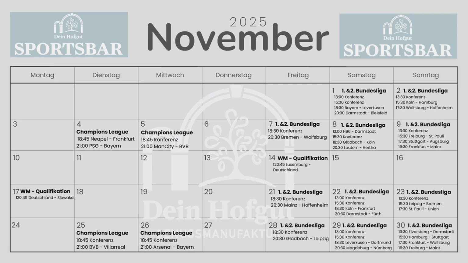 Öffnungszeiten SportsBar Spannung, Tore und Jubel garantiert! Unsere SportsBar öffnet zu den Spielen der 1. & 2. Bundesliga, Champions League und weiteren sportlichen Highlights. Die genauen Zeiten variieren – frag einfach kurz nach, wir freuen uns auf dich!